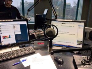 KMOX staffers including Ryan Wrecker and Carol Daniel prepare for a Holiday Radio Show