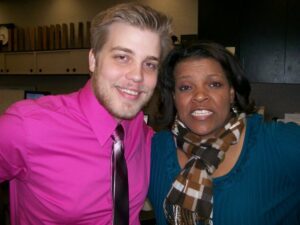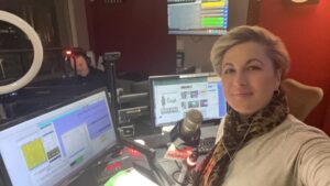Rodger Brand and Debbie Monterrey prepare before a Holiday Radio Show