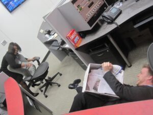 KMOX staffers Mark Reardon, Fred Bodimer, and Kevin Killeen are riveted by a car chase