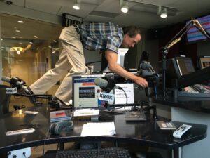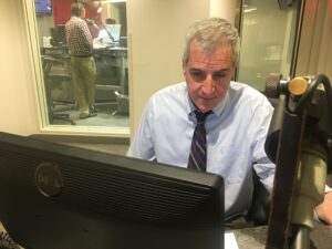 Former KMOX reporter Kevin Killeen works a story from his desk