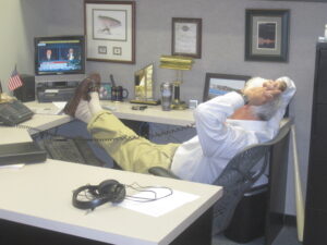 Kevin Killeen relaxes while working the phones for a story