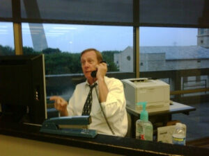 KMOX anchor Bill Reker answers the phone at the assignment desk at the old building at One Memorial Drive