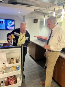 KMOX anchor Sean Michael Lisle fixes the office refrigerator as Kevin Killeen supervises