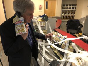 Kevin Killeen reacts to a prank played on his desk