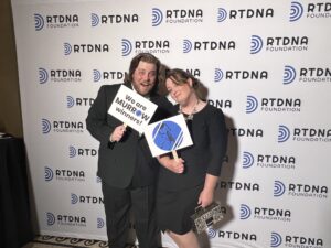 Michael Calhoun and Beth Coghlan celebrate KMOX winning a National Edward R Murrow award